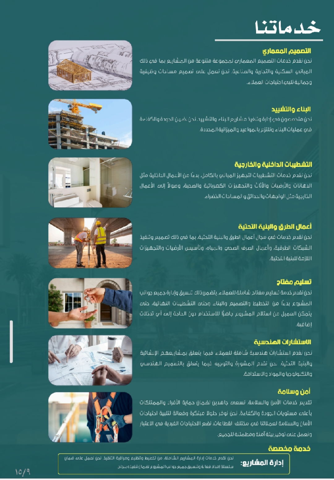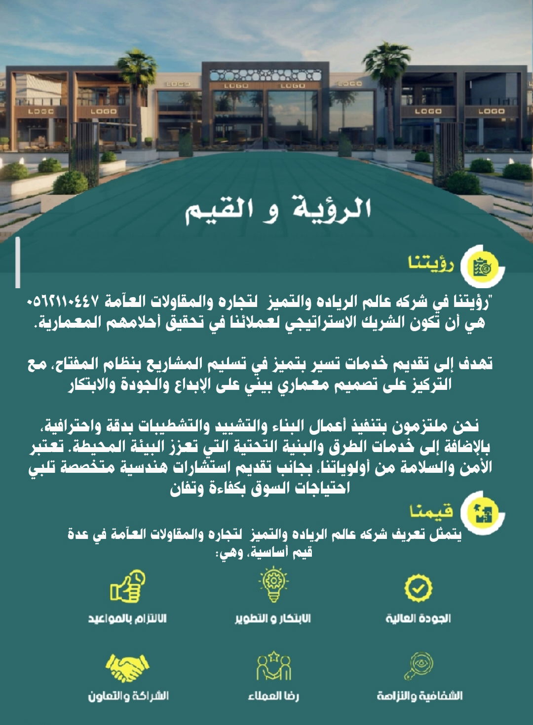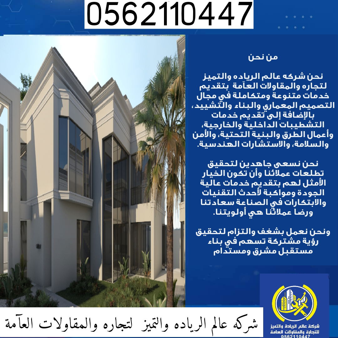 تنفيذ الأعمال والقوالب الخرسانية و أعمال الهياكل الحديدية والمباني السكنية و المشاريع التجارية والاستثمارية والحكومية وتسوير الأراضي البيضاء إنجاز كفاءة دقّة وجودة في العمل والأسعار مناسبة إنشاء /: مصانع - مستودعات - هناجر -تسوير الاراضي البيضاء المطلوب من بلدي -محطات وقود -مساجد -مدارس - قاعات - مجمعات سكنيه وتجاريه - منتجعات سياحية وترفيهية - عمائر - فلل - ملاحق - أحواش مسلح - تسوير شبوك - خزانات - مسابح - سواتر . عظم - تشطيب - ترميم -تسليم مفتاح 0541783775